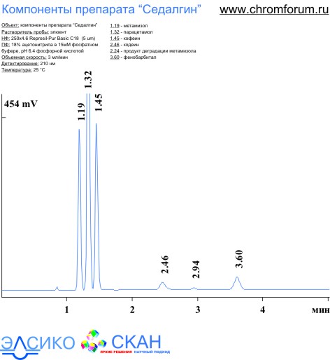 - ВЭЖХ анализ. ВЭЖХ определение компонентов пр. "Седалгин" (метамизол, парацетамол, кофеин, кодеин, фенобарбитал). ВЭЖХ колонка: 4.6x250 Reprosil-Pur Basic C18. Жидкостной хроматограф Gilson (Гилсон) с УФ детектором. www.chromforum.ru