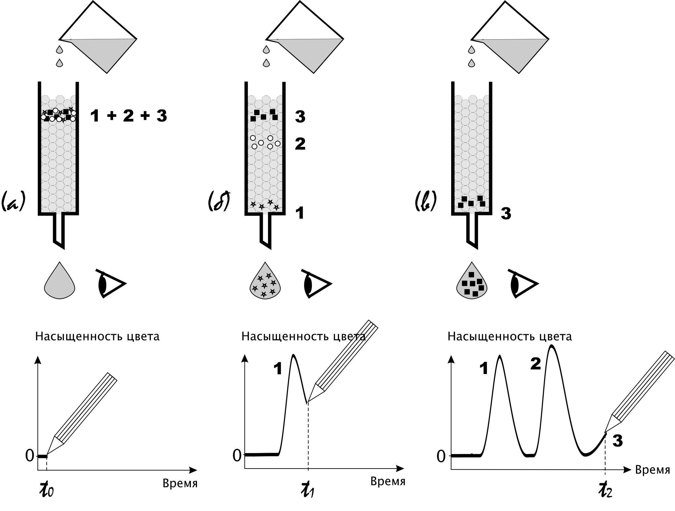 Мы будем наблюдать как за колонкой, так и за вытекающим из хроматографической колонки фильтратом, который называется элюатом. Причем попытаемся сделать наше наблюдение если не количественным, то хотя бы полуколичественным. Используя зрение как детектор (detector), мы будем строить график насыщенности цвета капель элюата от времени с момента начала анализа.