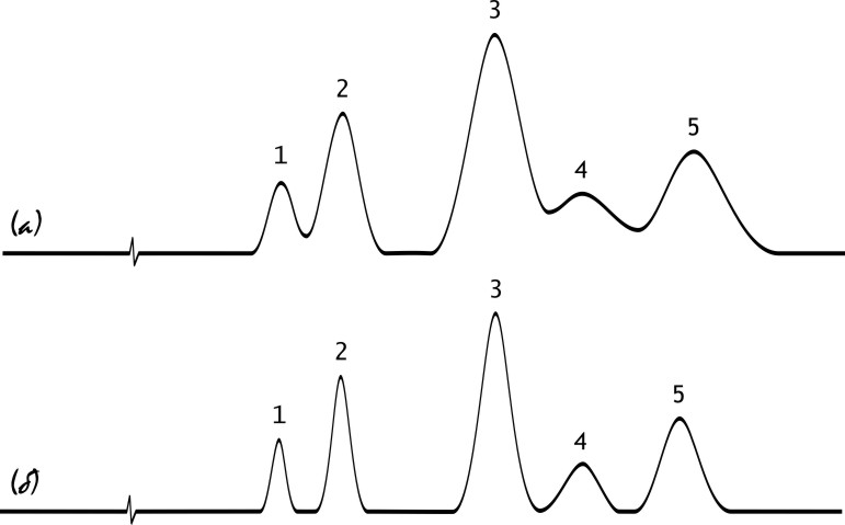 На рисунках 6а и 6б показаны хроматограммы с одинаковым удерживанием компонентов и селективностью, но различной эффективностью (на рисунке 6б эффективность ниже). Конечно же, на колонках с высокой эффективностью разрешение выше.