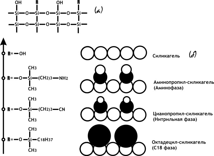 Главное то, что на основе силикагеля путем проведения химических реакций (химического модифицирования) промышленно получают широкий спектр адсорбентов самой разной полярности – от полярных амино-силикагеля и циано-силикагеля до неполярного С18 (читается «це восемнадцать»), или октадецил-силикагеля (см. рис. 11). Неполярный С18 силикагель фактически представляет собой силикагель, покрытый С18 углеводородом, то есть тончайшей прочной пленкой машинного масла!