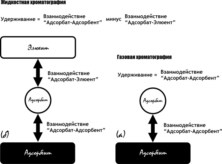 В жидкостной хроматографии картина немного сложнее. Адсорбат взаимодействует и с адсорбентом, и с элюентом. В результате, удерживание определяется разностью двух взаимодействий (см. рис. 12).