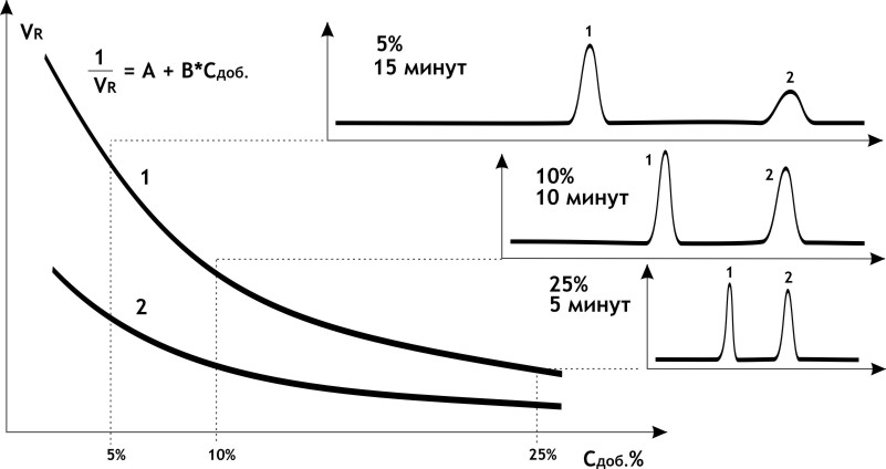 Этого примера вполне достаточно, чтобы пополнить наш лексикон порцией новых терминов. Основной компонент элюента (растворитель) будем назвать основой. Второй, дополнительный компонент элюента будем называть добавкой.