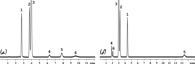 Рисунок 20. Хроматограммы компонентов препарата "Седалгин" в обращенно-фазовом режиме при нейтральном (а) и кислом (б) рН. а) рН = 6.5, б) рН = 2.5. Нейтральные вещества: (2) кофеин, (3) парацетамол, (5) фенобарбитал. Органические основания: (4) метиламиноантипирин - продукт деградации анальгина, (6) кодеин