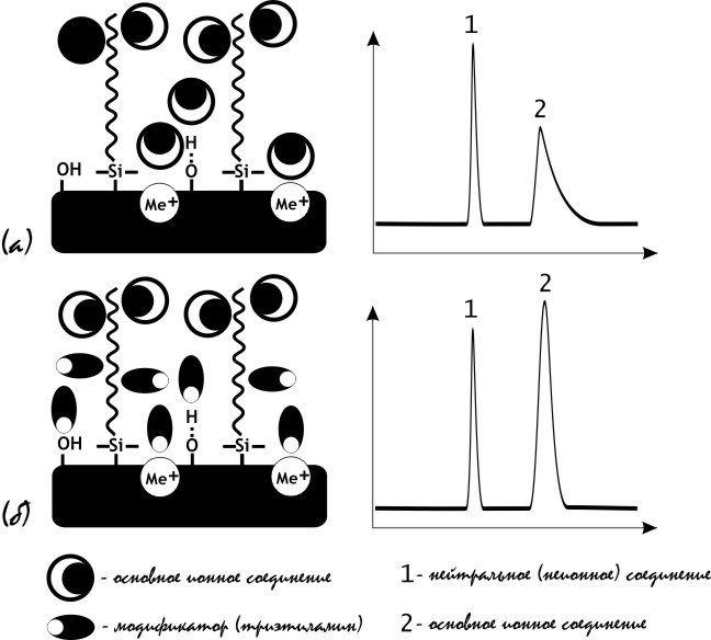 Для того, чтобы в ОФ хроматографии получить высокую эффективность разделения ионных соединений и стабильные времена их элюирования, необходимо по возможности выбирать такой рН элюента, чтобы все анализируемые соединения существовали исключительно в одной форме, молекулярной или ионной. Если при рН элюента какие-либо соединения будут существовать в разных формах, их пики будут уширены и искажены, а времена удерживания будут очень нестабильны.