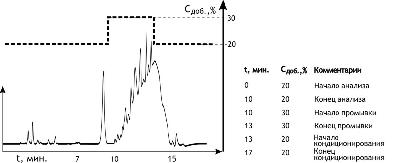 Рисунок 24. Профиль элюирования для изократического анализа со стадиями промывки и кондиционирования колонки