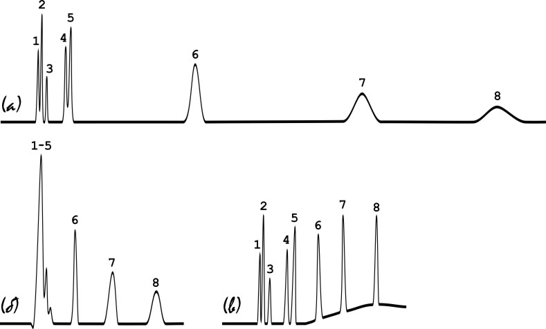 Возможные решения проблемы – сделать профиль градиента ступенчатым (то есть скомбинировав несколько изократических ступеней с разной элюирующей силой, см. рис. 26б, либо вообще разбить разделение на два изократических. Например, первый изократический анализ можно проводить до момента элюирования 4-ого компонента с применением менее сильного элюента, а второй – с применением более сильного элюента, оптимального для разделения компонентов от 5-ого до 8-ого (первые четыре при этом будут элюироваться в начале хроматограммы не разделенными). Очевидно, для первого разделения в конце хроматограммы будет необходимо запрограммировать промывку колонки от компонентов 5-8.