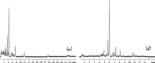 Рисунок 28. Пример применения градиентного (линейного) элюирования для скрининга флавонолов в растительных образцах в обращенно-фазовом режиме. (а) Изократическое элюирование с применением среднего по силе элюента; (б) градиентное элюирокание