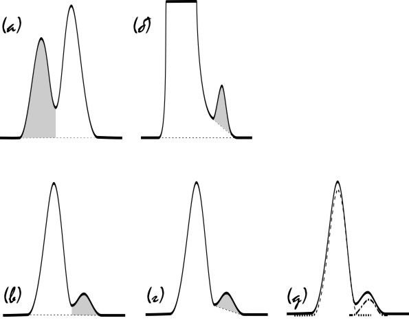 В этом случае необходимо понимать, что погрешность интегрирования тем больше, чем меньше разрешение и симметрия пиков. Но это еще не все. Погрешность также сильно зависит от соотношения высот неразделенных пиков. Она минимальна, если пики либо равны по высоте (см. рис. 75а), либо, напротив, один пик значительно превосходит по площади другой (см. рис. 75б). В случае большой разницы в площадях пиков погрешность интегрирования, очевидно, зависит от очередности элюирования и симметрии основного пика.