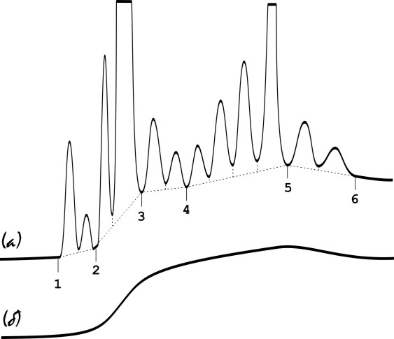 Рисунок 76. Вариант разметки сложной хроматограммы (а) при известном бланке (б)