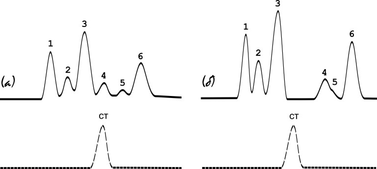 К. Сычев. Практический курс ВЭЖХ - жидкостной хроматографии. Вариант разметки сложной хроматограммы (а) при известном бланке (б). www.chromforum.ru