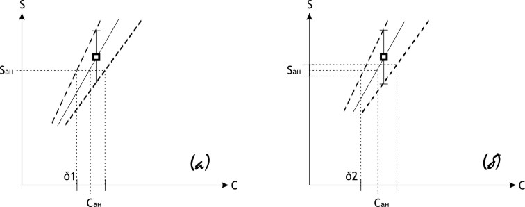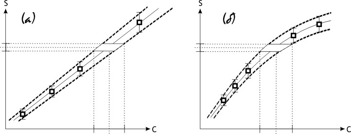 На градуировочный график (то есть график зависимости площади пика от концентрации) наносим полученную точку (сст, Sст) и доверительный интервал в этой точке (см. рис. 82а). Проводим через нее прямую, уходящую в начало координат – это наша градуировочная прямая. Через начало координат и верхнюю с нижней границами доверительного интервала соответственно проводим две прямые, наклон которых соответствует фиксированной относительной погрешности. Эти прямые (на рисунке пунктиром) обозначают доверительный интервал в окрестности ожидаемой концентрации. Чем выше концентрация, тем шире будет доверительный интервал, выраженный в абсолютных единицах – но выраженный в процентах не изменится (эта простая модель подразумевает независимость относительной погрешности измерения от концентрации).