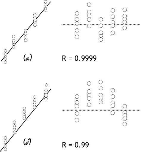 При проведении градуировки по нескольким точкам в случае применения детектора с линейным откликом первым делом пытаются аппроксимировать градуировочную кривую линейной функцией, то есть провести линейную регрессию. Дальше смотрят, насколько эта аппроксимация приемлема, и только потом при необходимости переходят к функциям другого вида. Для оценки же приемлемости аппроксимации (неважно –линейной или нет) существуют два основных критерия.