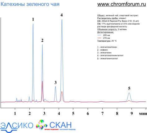- ВЭЖХ разделение катехинов зеленого чая на колонке 4.6x250 Reprosil-Pur Basic C18. Жидкостной хроматограф Gilson (Гилсон) с УФ детектором. www.chromforum.ru