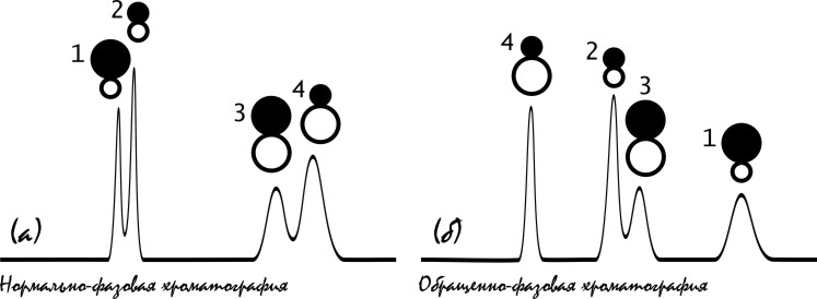 Рисунок 13. Интуитивно понятная схема, иллюстрирующая порядок элюирования веществ в нормально-фазовой и обращенно-фазовой хроматографии