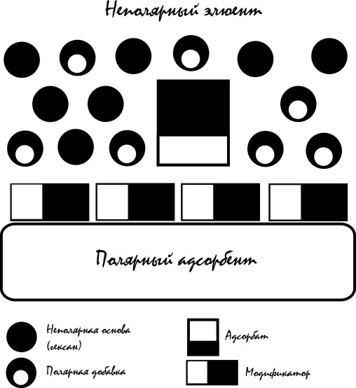 Термин «модификатор» указывает на то, что данный растворитель способен значительно модифицировать, изменять структуру поверхности адсорбента и, таким образом, значительно влиять на его свойства. В «классическом» варианте концентрация модификатора может изменяться от сотых долей процента до нескольких процентов. Молекулы модификатора образуют на поверхности полярного адсорбента адсорбционный слой модификатора (см. рис. 15). Одним из самых распространенных модификаторов в НФ ВЭЖХ является уксусная кислота.