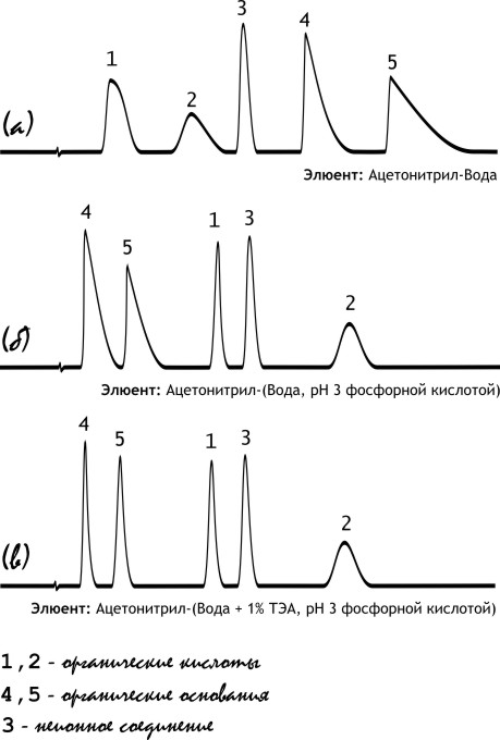 Для того, чтобы в ОФ хроматографии получить высокую эффективность разделения ионных соединений и стабильные времена их элюирования, необходимо по возможности выбирать такой рН элюента, чтобы все анализируемые соединения существовали исключительно в одной форме, молекулярной или ионной. Если при рН элюента какие-либо соединения будут существовать в разных формах, их пики будут уширены и искажены, а времена удерживания будут очень нестабильны.
