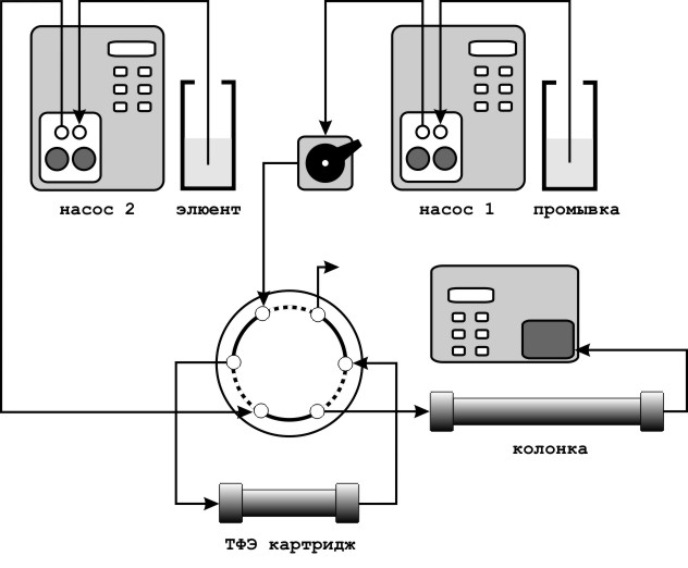 ВЭЖХ системы для последовательного проведения высокоэффективной очистки пробы и хроматографического разделения. Наиболее простой системой такого рода является ВЭЖХ с он-лайн твердофазной экстракцей, он-лайн ТФЭ. После системы инжектирования устанавливают переключающий кран, на котором монтируют адсорбционный картридж (или очень короткую колонку, например, предколонку длиной 10-20 мм), а также (в другую позицию крана) основную хроматографическую колонку. Инжектор соединяют с насосом, подающим промывочную жидкость для картриджа. Позицию крана, в которую установлена хроматографическая колонка, соединяют со вторым насосом, который подает элюент.