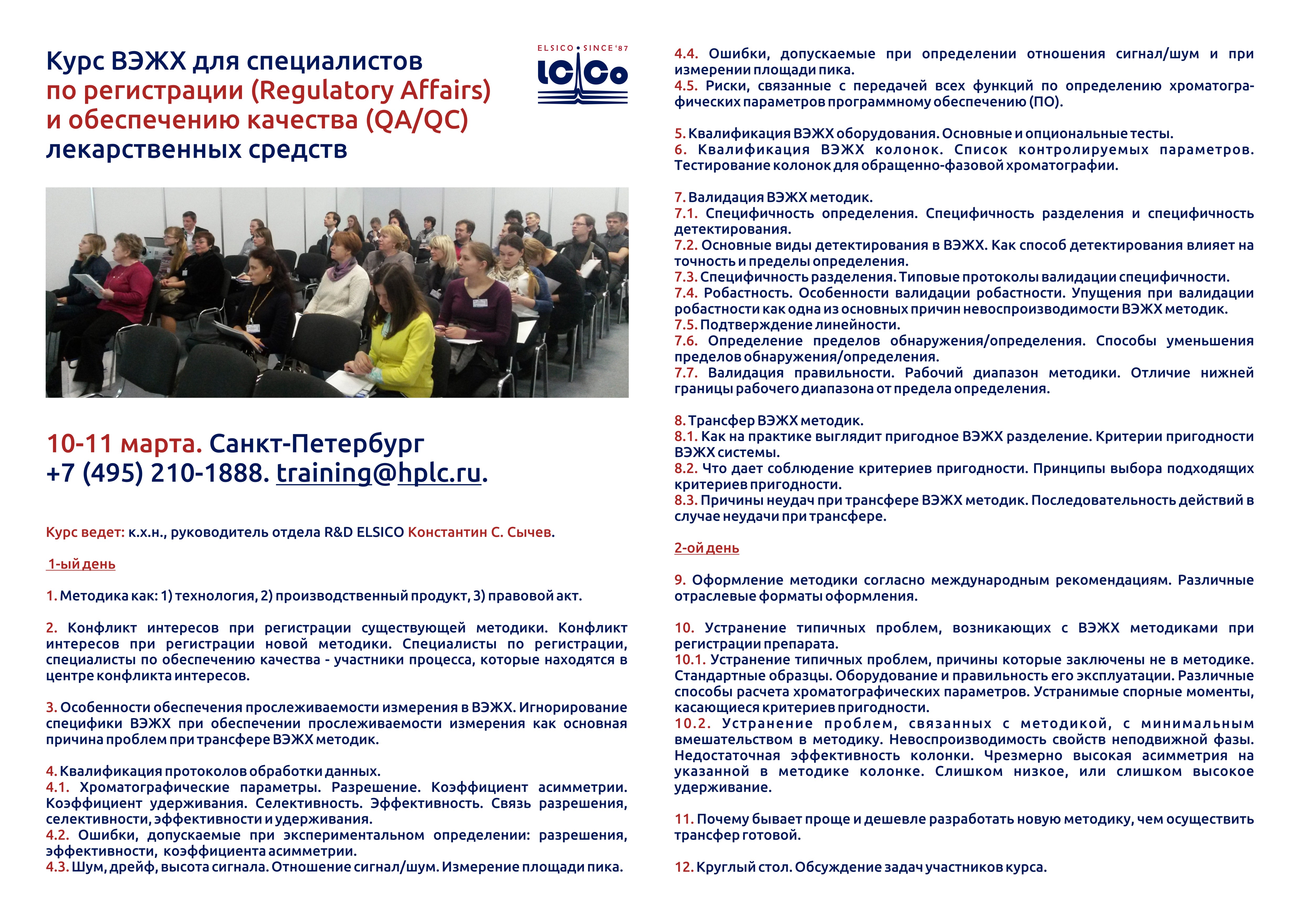 Уважаемые коллеги! 10 и 11 марта компания "ЭЛСИКО" проводит выездные курсы по ВЭЖХ в Санкт-Петербурге. Тема курса: "Курс ВЭЖХ для специалистов по регистрации и обеспечению качества (QA/QC) лекарственных средств"