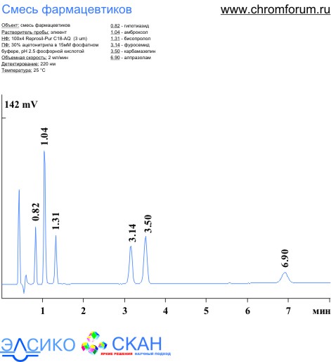 ВЭЖХ разделение смеси фармацевтиков на колонке Reprosil-Pur C18-AQ. Жидкостной хроматограф Gilson (Гилсон) с УФ детектором. www.chromforum.ru