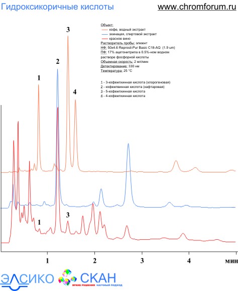 2. Разделение гидроксикоричных кислот в различных объектах на колонке 4.6x50 Reprosil-Pur Basic C18
