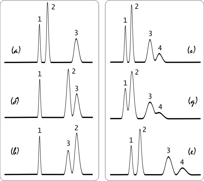 К. Сычев. Разделения одинаковой и различной селективностями. А, б, в – разделение трехкомпонентной смеси в системах с различной селективностью: б – селективность отлична от а), но порядок элюирования сохраняется, в – селективность отлична от а), причем изменяется и сам порядок элюирования. Г, д, е – разделения четырехкомпонентной смеси в системах с одинаковой селективностью: д – при отличной от г) эффективности, е – при отличном от г) удерживании. www.chromforum.ru