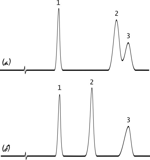 На рисунках 6а и 6б показаны хроматограммы с одинаковым удерживанием компонентов и селективностью, но различной эффективностью (на рисунке 6б эффективность ниже). Конечно же, на колонках с высокой эффективностью разрешение выше.