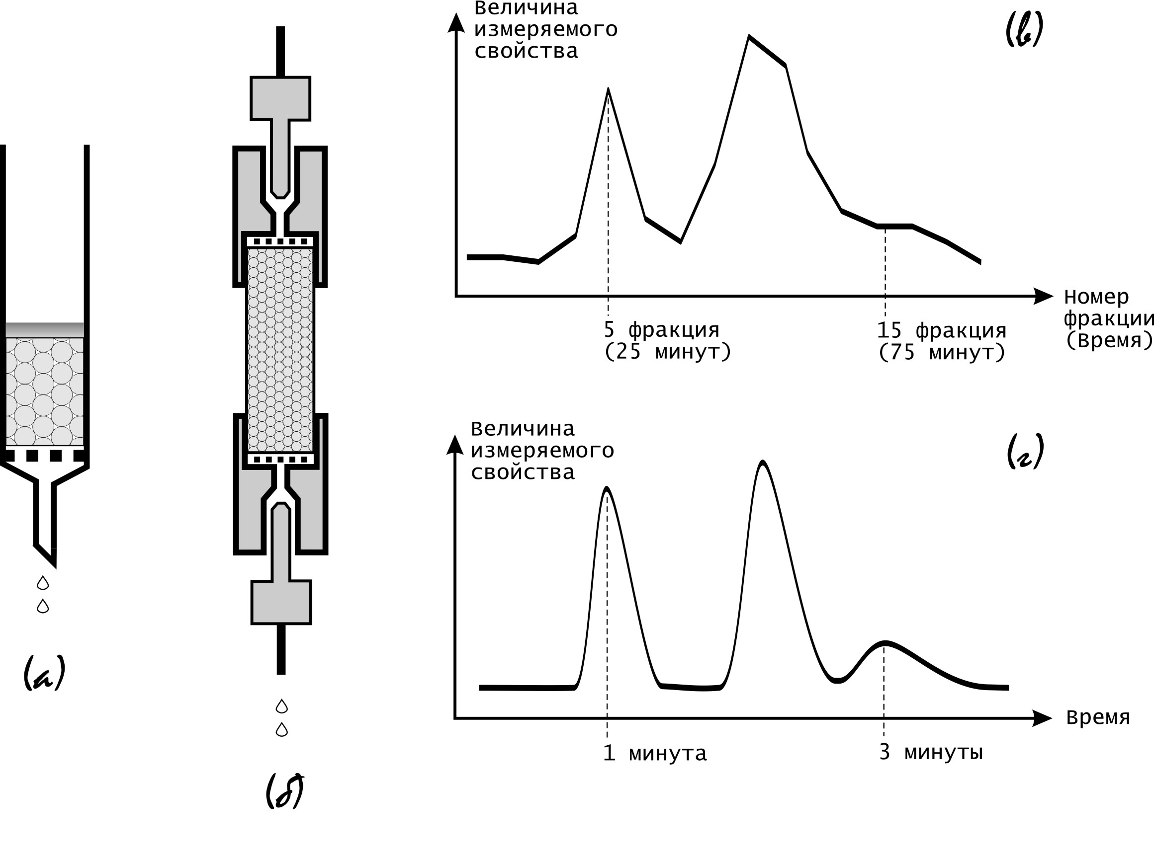 Сначала берут специальную стеклянную трубку (вообще говоря, она называется колонкой, как ни странно) длиной около 20 см и диаметром 1-2 см с пористым стеклянным фильтром на дне и сужающимся горлышком (см. рис. 2а). Закрепляют ее на штативе в вертикальном положении. Аккуратно переносят в колонку 5-8 см адсорбционного материала – пористого порошка с зернением (средним диаметром частиц) порядка 100 микрометров, то есть 0.1 мм. Колонка готова.