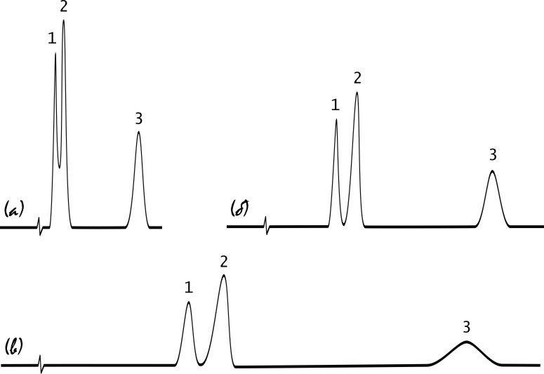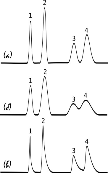 На рисунках 6а и 6б показаны хроматограммы с одинаковым удерживанием компонентов и селективностью, но различной эффективностью (на рисунке 6б эффективность ниже). Конечно же, на колонках с высокой эффективностью разрешение выше.