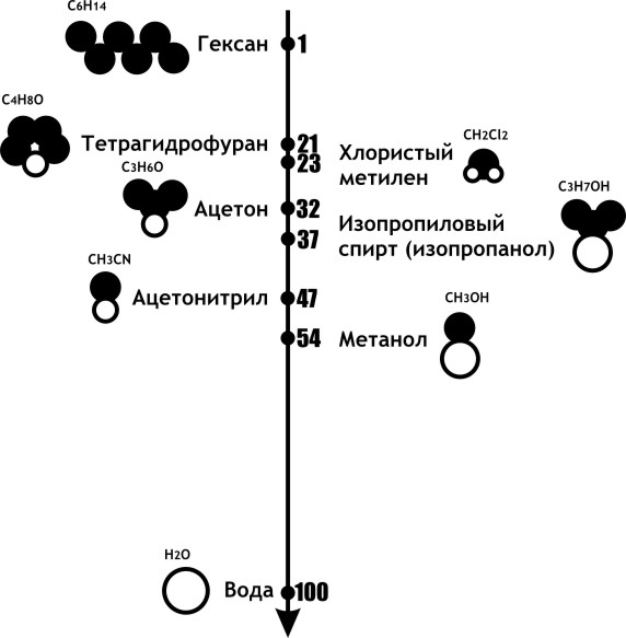 Рисунок 10. Ряд полярности растворителей, применяемых в жидкостной хроматографии