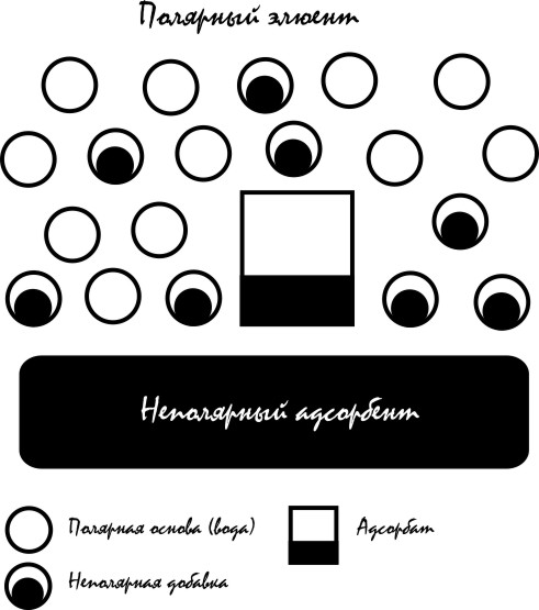 Теперь еще один мысленный эксперимент. Представим, что молекула любого вещества (адсорбата) состоит из двух частичек – полностью неполярной (черного цвета) и полностью полярной (белого цвета). То есть получается такая несимметричная черно-белая гантелька. У более полярных веществ белая долька больше, а черная меньше, а у более неполярных – наоборот.