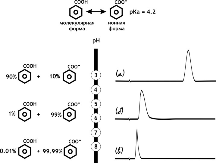 При кислотности элюента рН = pKa концентрации молекулярной формы и ионной формы в растворе равны. Если «закислить» раствор сильной кислотой, добавив таким образом в раствор протонов Н+, равновесие сместится в сторону образования молекулярной формы бензойной кислоты. То есть сильная кислота подавит ионизацию слабой. Наоборот, если «подщелочить» элюент, но кислота практически целиком перейдет в анион. Для бензойной кислоты для этого достаточно просто нейтрального рН = 7 (см. рис. 18).