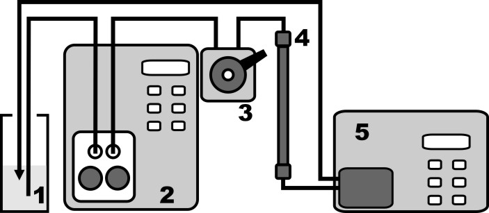 Значительной экономии расхода элюента можно добиться применением простой изократической насосной системы в так называемой конфигурации рецикла элюента: жидкостную систему хроматографа замыкают, то есть направляют слив элюата обратно в емкость для отбора элюента (см. рис. 25).
