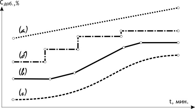 Рисунок 26. Варианты градиентного элюирования: (а) линейный, (б) ступенчатый, (в) кусочно-линейный, (г) задаваемый плавной функцией