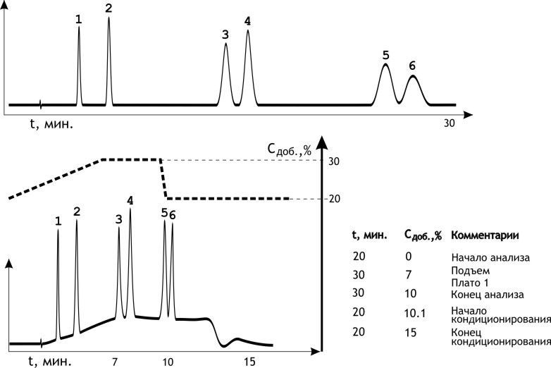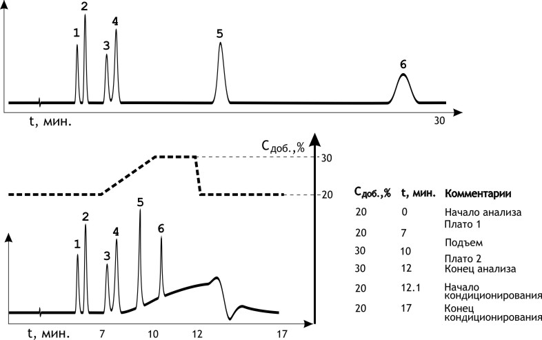 5. Ступень кондиционирования колонки повышает длительность анализа: на системах со смешиванием в области высокого давления – до трети, на системах со смешиванием в области низкого давления – до половины от всего времени анализа.