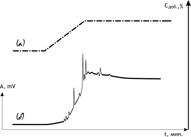 Рисунок 33. Вид базовой линии (б) на подъеме градиента (а) при применении грязных растворителей