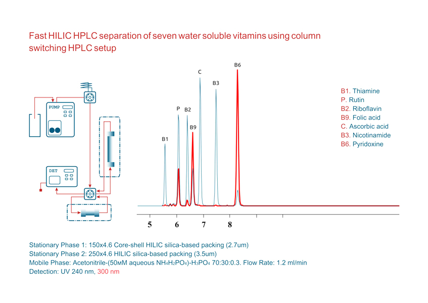 Метод определения содержания водорастворимых витаминов с помощью высокоэффективной жидкостной хроматографии со спектрофотометрическим детектированием. Изократический хроматограф с насосом, многоволновым УФ (MWD) детектором, термостатом, двумя колонками и краном переключения. Например Agilent модель 1260.