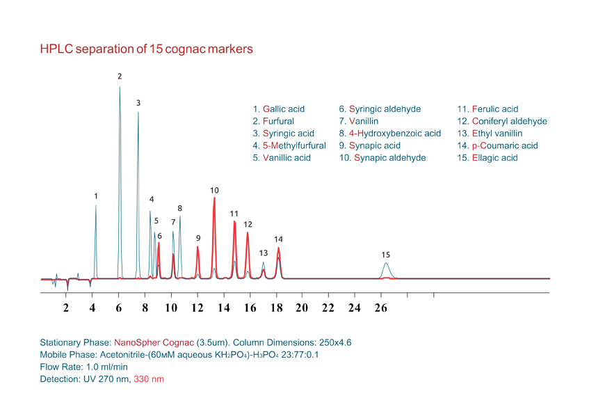 Метод определения качественного и количественного содержания кислот и примесей в коньяках с помощью высокоэффективной жидкостной хроматографии со спектрофотометрическим детектированием. Изократический хроматограф с насосом, многоволновым УФ (MWD) детектором, термостатом, одной колонкой. Например Thermo Scientific модель UltiMate 3000.